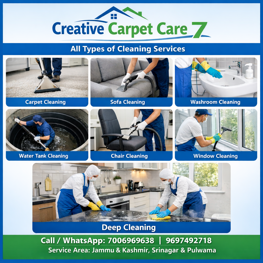 We provide professional cleaning services to keep your home and spaces fresh, hygienic, and well-maintained. Our services include carpet cleaning, sofa cleaning, washroom cleaning, water tank cleaning, chair cleaning, deep cleaning, and window cleaning for homes and small commercial spaces. With trained staff, modern equipment, and safe, effective cleaning solutions, we ensure high standards of cleanliness, hygiene, and customer satisfaction.